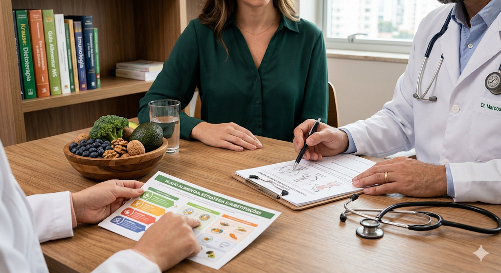 Uma vez identificado o problema pelo olhar médico, o nutricionista entra em cena para transformar o diagnóstico em um plano de ação prático e prazeroso.