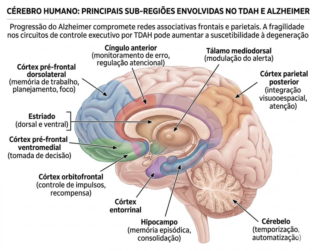 A relação entre TDAH e Alzheimer pode ser compreendida a partir de uma leitura por circuitos. No TDAH, as estruturas mais implicadas incluem o córtex pré-frontal dorsolateral, o córtex pré-frontal ventromedial, o córtex orbitofrontal, o cíngulo anterior, os gânglios da base, o tálamo e o cerebelo. Essas regiões participam da regulação da atenção, da inibição comportamental e da organização temporal da ação.
