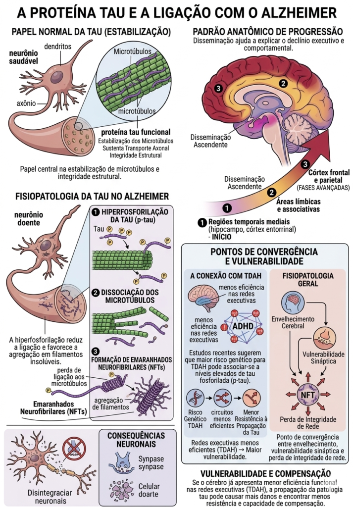 Em termos fisiopatológicos, a tau pode ser entendida como um ponto de convergência entre envelhecimento cerebral, vulnerabilidade sináptica e perda de integridade de rede. Se o cérebro já apresenta menor eficiência funcional nas redes executivas, como ocorre no TDAH, a propagação da patologia tau pode encontrar menos resistência funcional e menos capacidade de compensação.